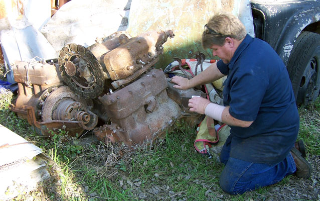 Daniel Bratcher checking Model T engine numbers at a San Antonio metal salvage yard, January 2013