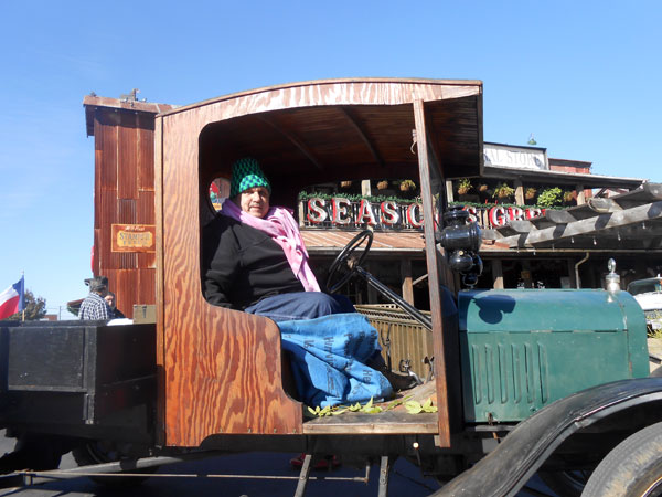 Jerry King and Beverly Luce bombing along in their 26 Runabout near the third location during the On & Off Fredericksburg Road Art Gallery Tour, February 2013