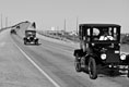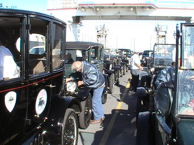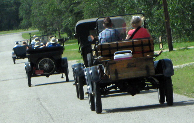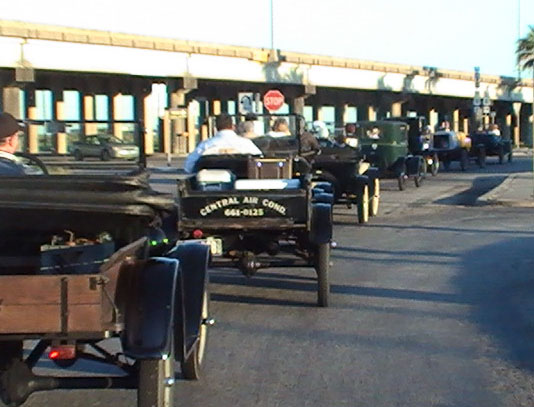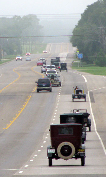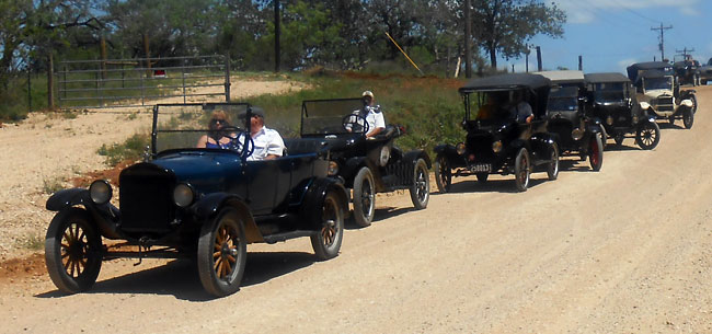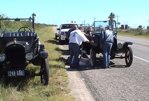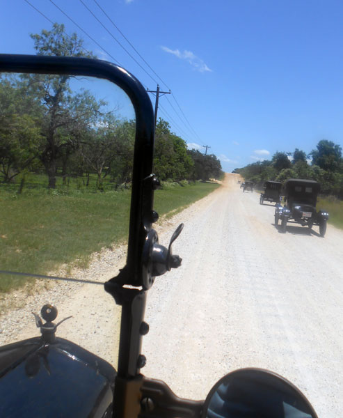 Ford Model Ts filling up before a steep hill on HWY 16 south of Kerrville, April 2013
