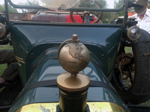 Rotating globe hood ornament on Dirk & Trudy Regter's 1915 Ford Model T, May 2013