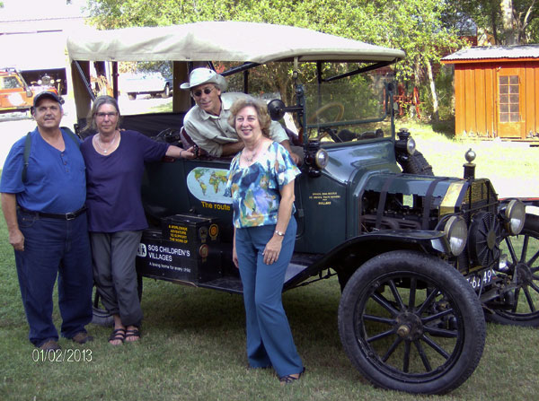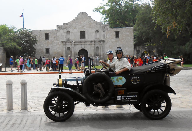 Dirk and Trudy Regter made an altogether too brief stop in San Antonio on their world tour in their 1915 Ford Model T to raise funds for "SOS Children's Villages International," which aims to provide loving homes for orphans around the world. TFOT members Anton and Mary Ann Hajek invited the couple and their two friends driving the tour support vehicle to stay with them, and hosted a fun evening for them and many TFOT members. In the morning they headed down town for some snaps at the Alamo before heading west as far as Las Vegas before heading north to Canada before returning to Houston along the eastern seaboard. On their way here they met with the Houston, College Station and Austin clubs. We assume their welcome in Texas will be matched around the country. The project and the people involved deserve nothing less.