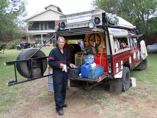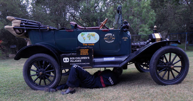 Dirk Regter's lubricating his 1915 Ford Model T prior to another day's long drive, May 2013