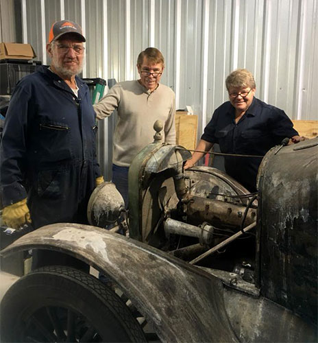 Ernest Lehman, Dave Tagert and Daniel Bratcher after getting the engine run on a 1919 Ford Model T belonging to Ernest after being saved from a barn where it had rested since 1966