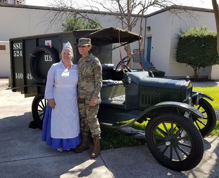 Beverly Luce with LTG Nadja West and the historic Ford Model T ambulance at Fort Sam Houston, March 2018