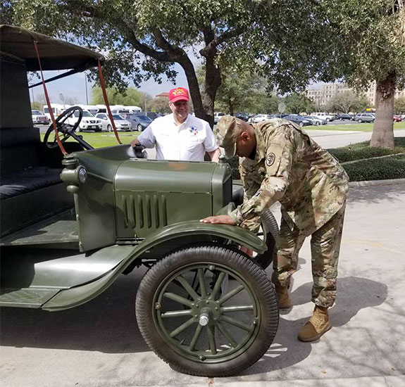 Jerry King teaching CSM Michael Gragg how to start and drive the historic Ford Model T ambulance at Fort Sam Houston, March 2018