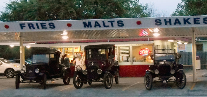 Ford Model Ts at an old fahioned drive-in cafe in Victoria during the Victoria Tour, March 2018