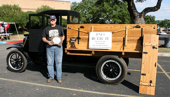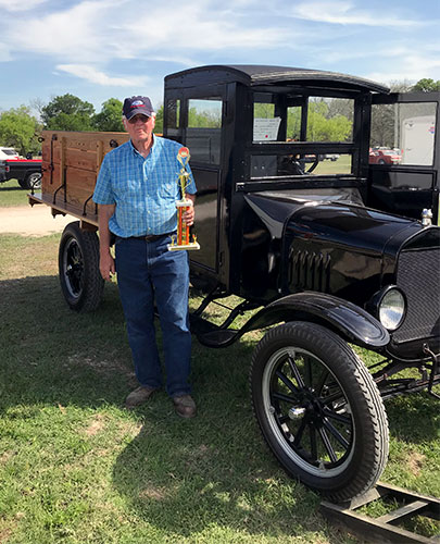 DuWayne Headrick with his award for his 1926 Ford Model TT truck at the Shriner charity car show in San Antonio, May 2018
