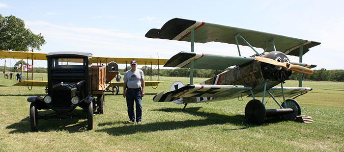 DuWayne Headrick with his 1926 Ford Model TT truck and a WWI Fokker Triplane at "Wings & Wheels," at the Kingsbury Aerodrome, April 2018