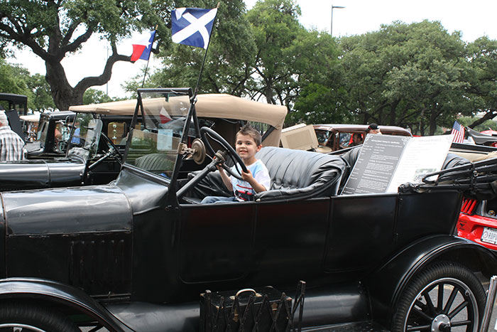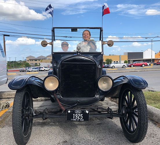 Young man having his picture taken in Hugh Hemphill's 1925 Ford Model T at the Shriner charity car show in San Antonio, May 2018