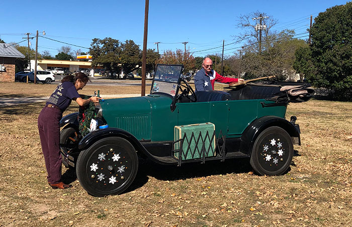 Jennifer and Mike Mackechney decorating their 1926 Ford Model T touring car for the Boerne Christmas Parade, December 2018