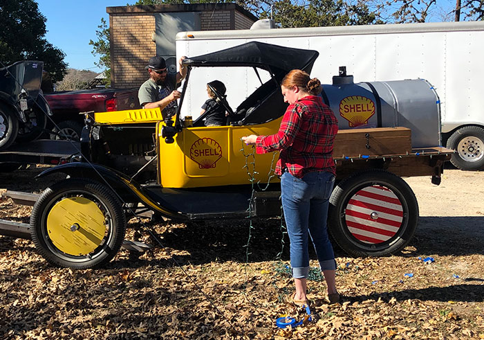 Lauren and Anthony Mackechney decorating their 1923 Ford Model T tanker truck for the Boerne Christmas Parade, December 2018