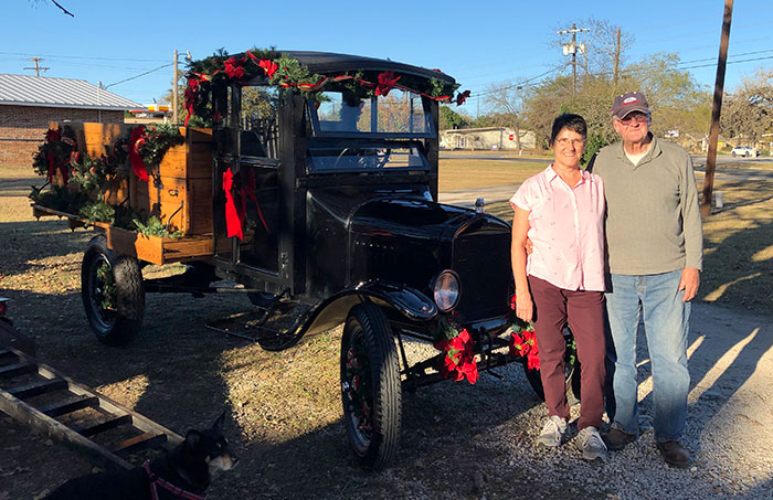 Connie and DuWayne Headrick with their 1926 Ford Model TT truck before the Boerne Christmas Parade, December 2018