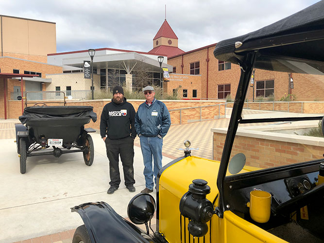 Former LEE graduates Anthony Mackechney (2007) and Michael Mackechney (19800 - also father and son, brought their Ford Model Ts to LEE high school in San Antonio, to be part of a STEM project presentation, December 2018