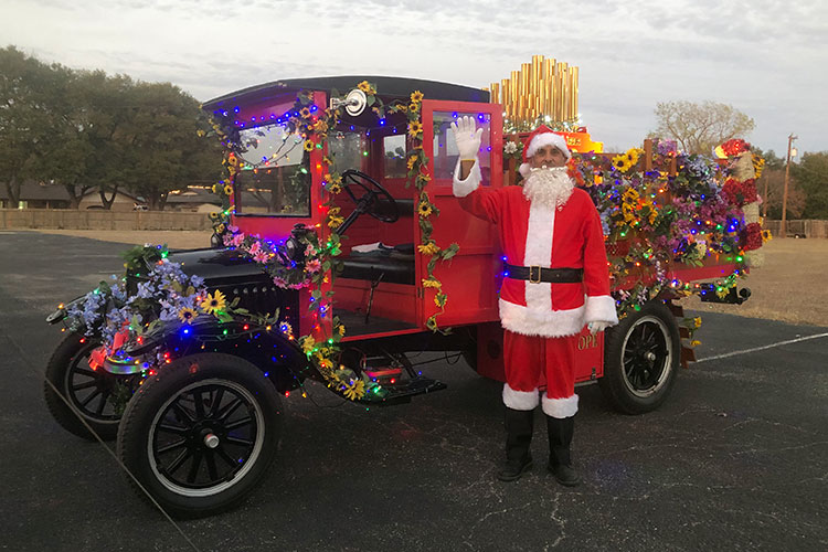 Santa with Joey Groff's 1924 Ford Model TT prior to a drive around Windcrest, December 2020