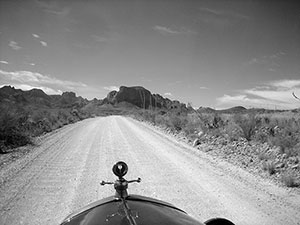 View through the windshield of one of James & Laurie Deatherage's Ford Model Ts on a local solo drive, April 2020