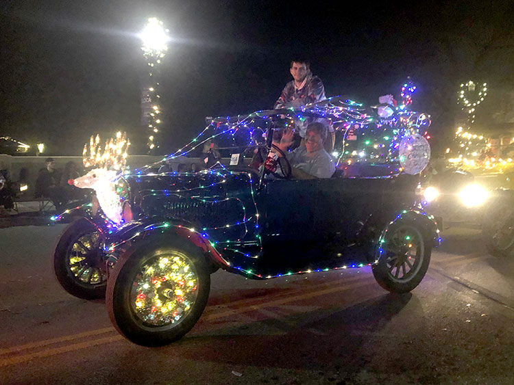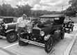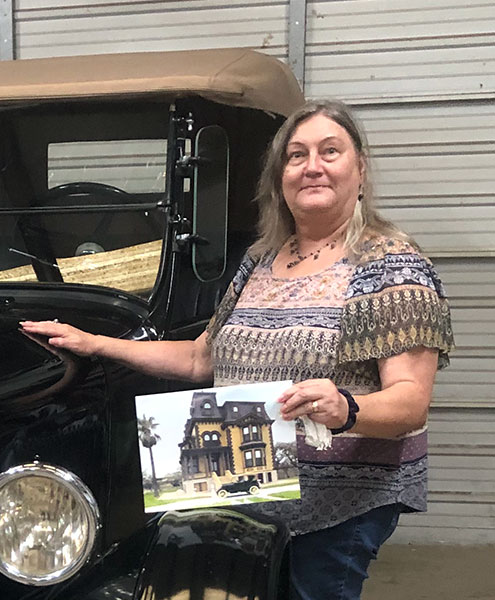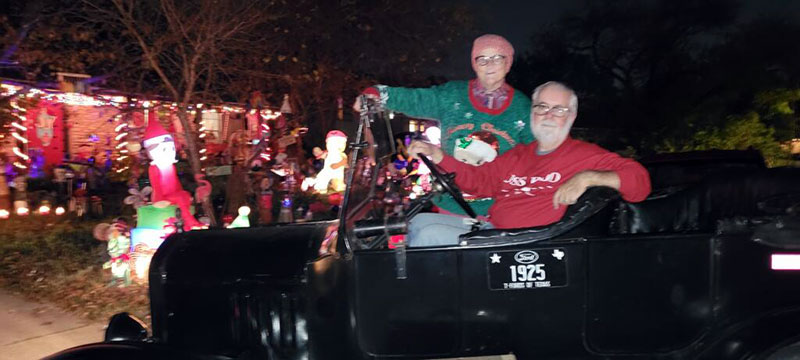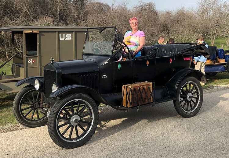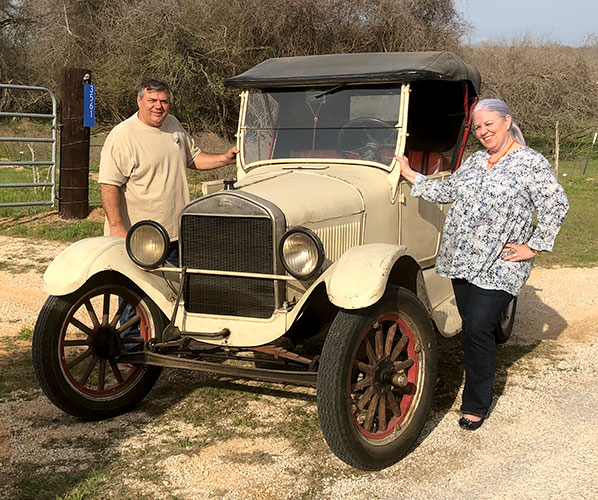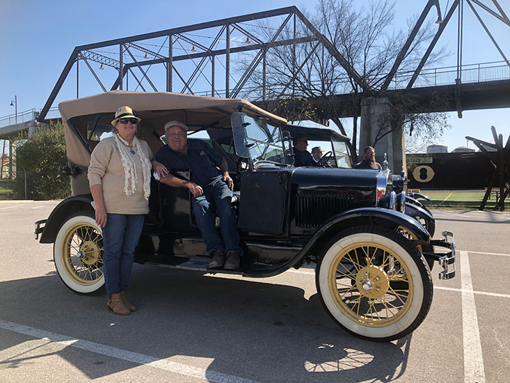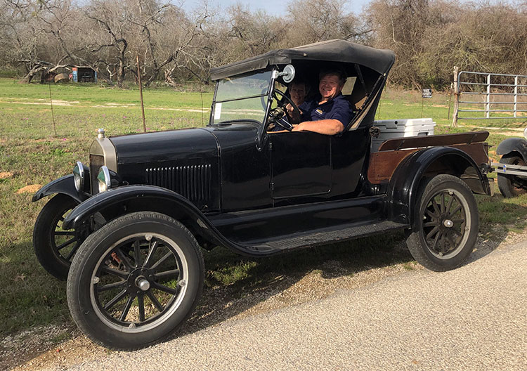 Steve and Lynn Estevez arriving at a joint Model A and Model T Fords visit to a San Antonio retirement community, July 2021