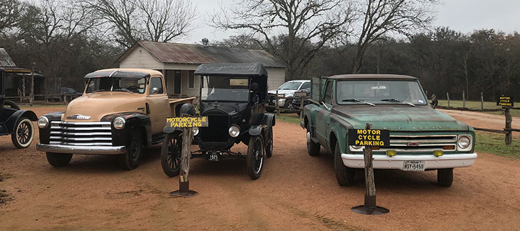 Ford Model Ts and vintage Chevy trucks in Sisterdale, Hill Country Tour, February 2021
