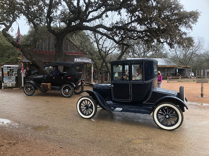 Two Model Ts passing the Luckenbach post office, Hill Country Tour, February 2021