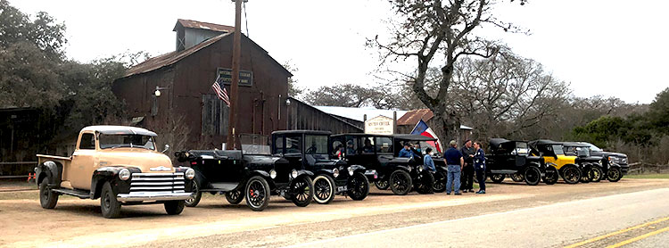 Model Ts at Kendalia Halle, Hill Country Tour, February 2021