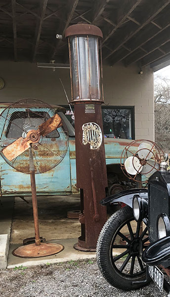 Ford Model Ts at an old service station in Sisterdale, Hill Country Tour, February 2021