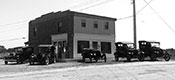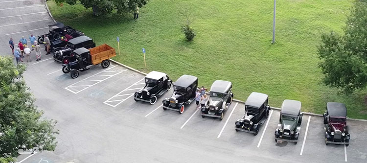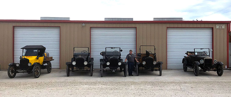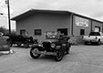 Model Ts parked outside "Timeless T Services" at the spring club meeting, April 2021
