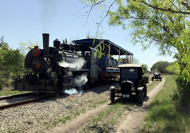1925 steam locomotive passing a couple of Ford Model Ts at the Texas Transportation Museum in San Antonio, April 2021