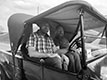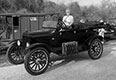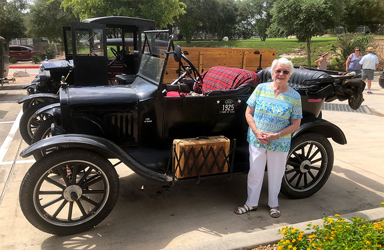 A young lady born in 1925 with a 1925 touring car during a joint Model A and Model T Fords visit to a San Antonio retirement community, July 2021