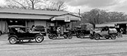 One Model A and four Model T Ford at the Heritage Barber Shop in La Vernia, July 2021