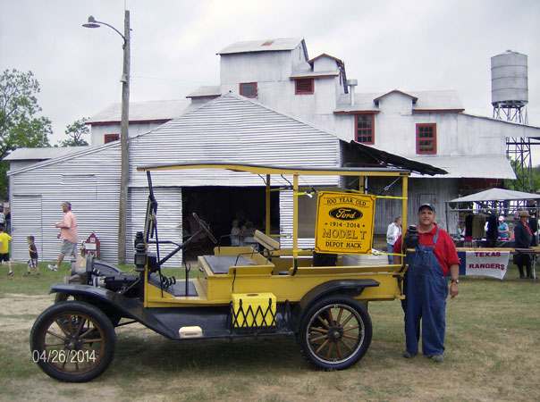 Anton Hajek with his 100 year old 1914 Ford Model T depot hack at the 100 year old cotton gin in Burton, TX, April 2014