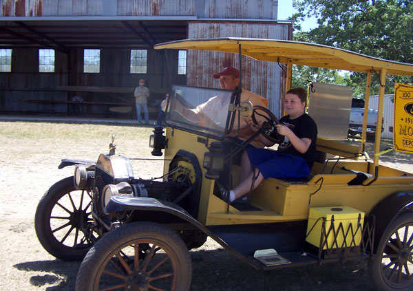 Anton Hajek teaching a young man how to drive his his 100 year old 1914 Ford Model T depot hack at Spring 2014 'Fly-In' at the Pionewer Flight Museum, Kingsbury Aerodrome