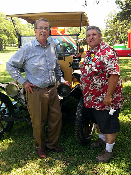 Anton Hajek with his 1914 Ford Model T depot hack at Mission Concepcion with club president Jerry King, August 2015