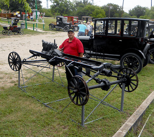 Anton Hajek with a Model T frame and engine display he built for the Texas Transportation Museum at the 2016 San Antonio Ford Model T Show