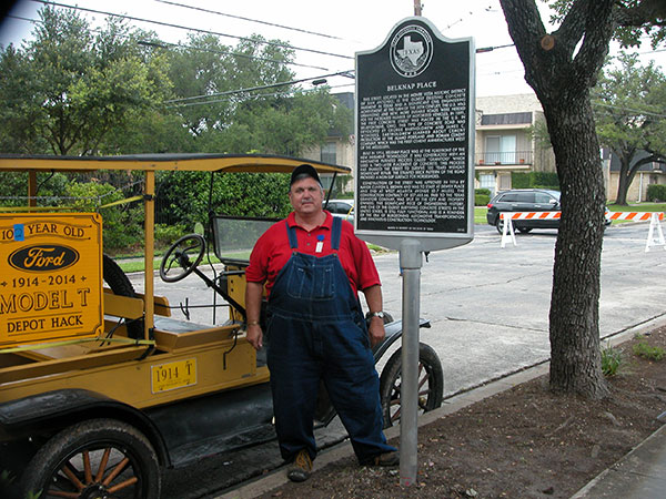 Anton Hajek with his 1914 Ford Model T depot hack at a history marker on Belkanp Place, San Antonio, May 2016
