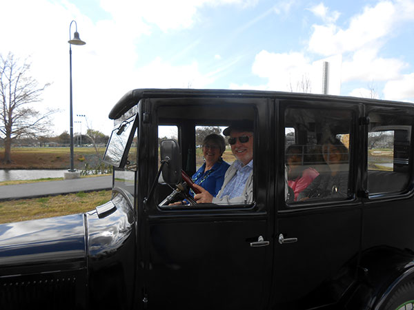 Bob and Judy Abbey and paasengers in their 1927 Ford Model T Fordor, February 2016