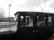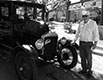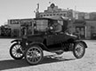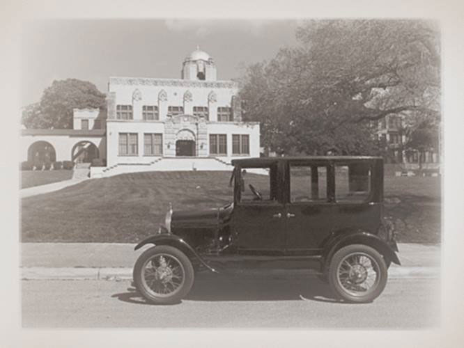 "antiqued" version of an image of Bob and Judy Abbey's 1927 Ford Model T Fordor at Jefferson High School, February 2016