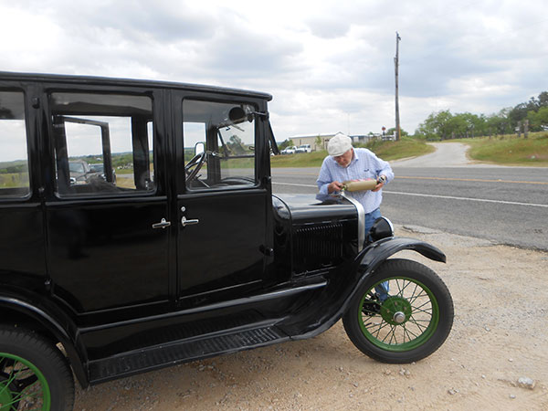 Bob Abbey topping up the radiator in his 1927 Ford Model T Fordor during the Wilson County tour, April 2016