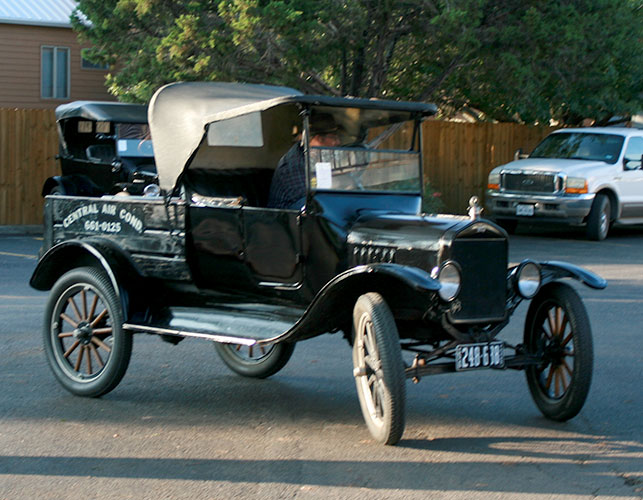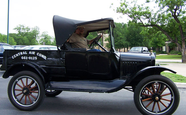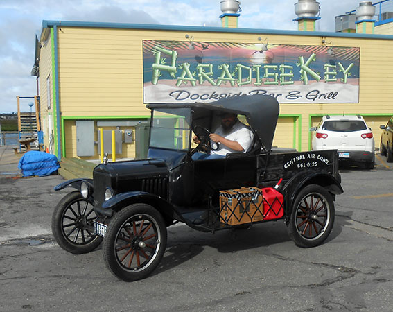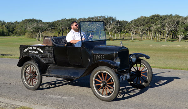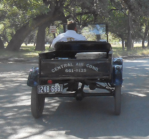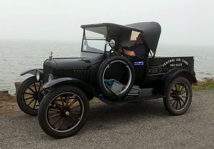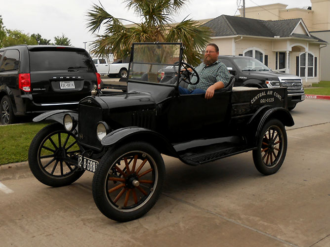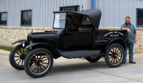 Clint Bitterly and 1923 Ford Model T runabout outside the family business, "Central Air-Conditioning," April 2014