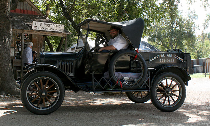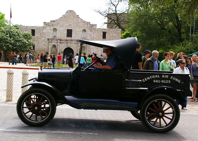 Clint Bitterly in his 1923 Ford Model T runabout at the Alamo