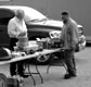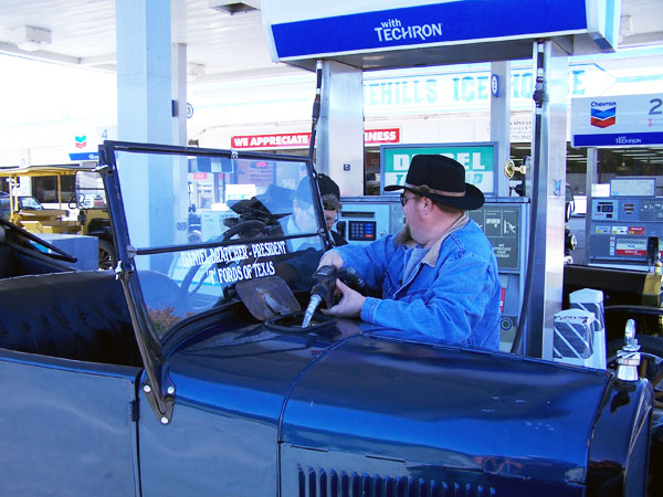 Clint Bitterly pumping gas into TFOT president Daniel Bratcher 1926 Ford Model T during the TFOT Medina County tour