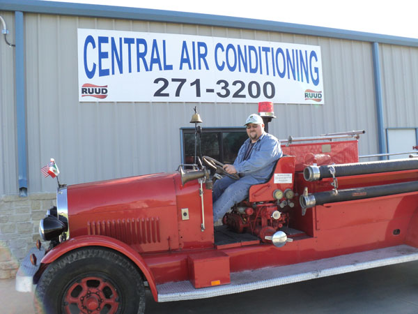 Clint Bitterly at the family A/C business driving a 1924 Buffalo fire truck belonging to the Texas Transportation Museum