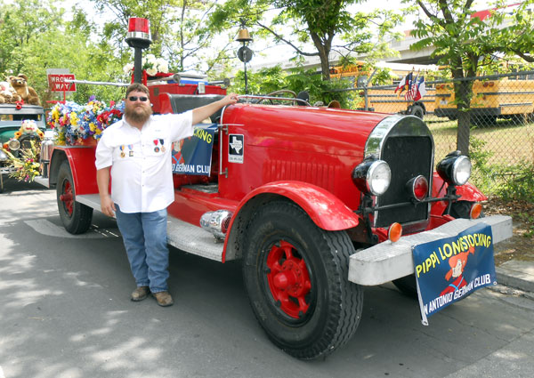 Clint Bitterly with the 1924 Buffalo fire truck he drove in the April 2014 "Battle of Flowers" Fiesta parade