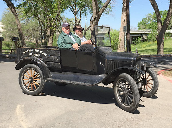 Clint Bitterly with Willie Cordes in his 1923 Ford Model T runabout during a tour in Seguin, March 2016