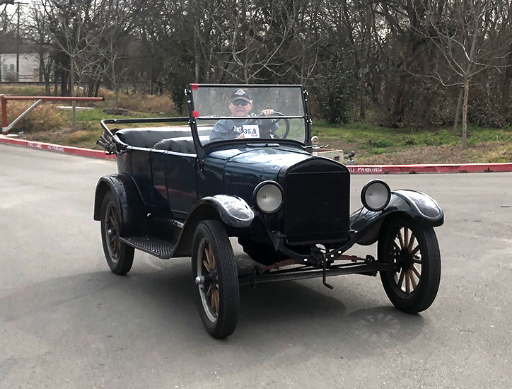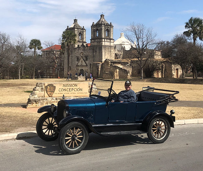 Daniel Bratcher in his 1926 Ford Model T during the February 2022 Missions Tour
