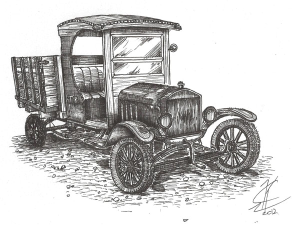 A drawing of the 1924 TT, affectionately known as "Grave Digger" from its former use by a tomb stone installer, owned in part by Daniel Bratcher, TFOT president, made at the 2012 San Antonio Ford Model T show