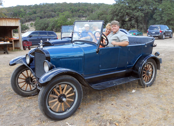 Daniel Bratcher in his 1926 Ford Model T with Vicky Kincaid during the Medina Lake tour, June 2015