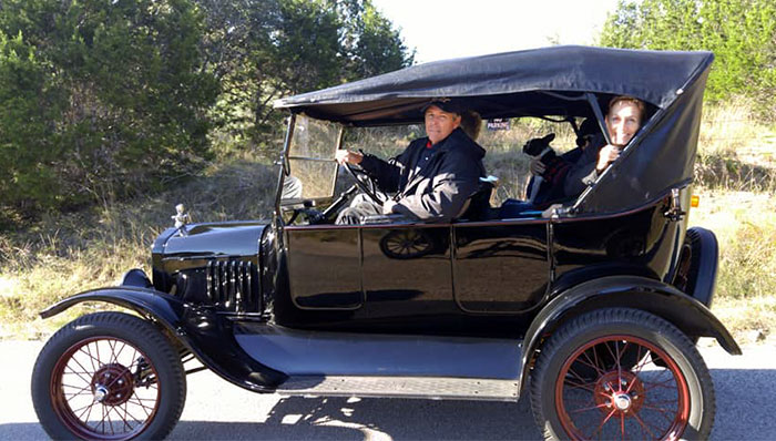 Kathy and Dave Tagert in a borrowed Ford Model T during the Texas Hill Country tour, February 2021