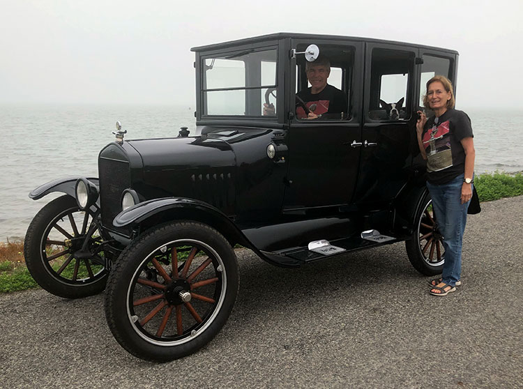 Dave & Kathye Tagert (and dog) with their 1925 Ford Model T Fordor during the 2021 Rockport tour