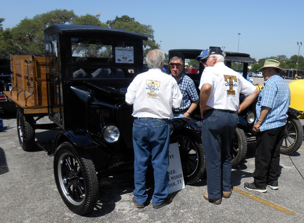 TFOT members and visitors discuss the finer points of DuWayne Headrick's 1926 Ford Model TT truck at the 2014 Shriner Car Show