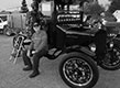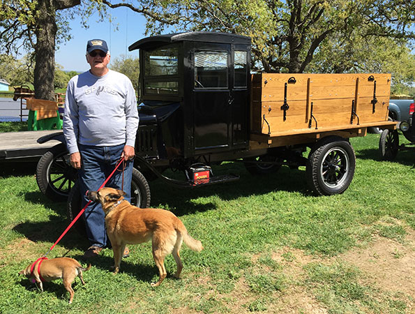 DuWayne Headrick and dogs with his 1926 Ford Model TT at a TT tour in Seguin, March 2016