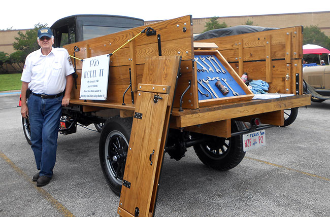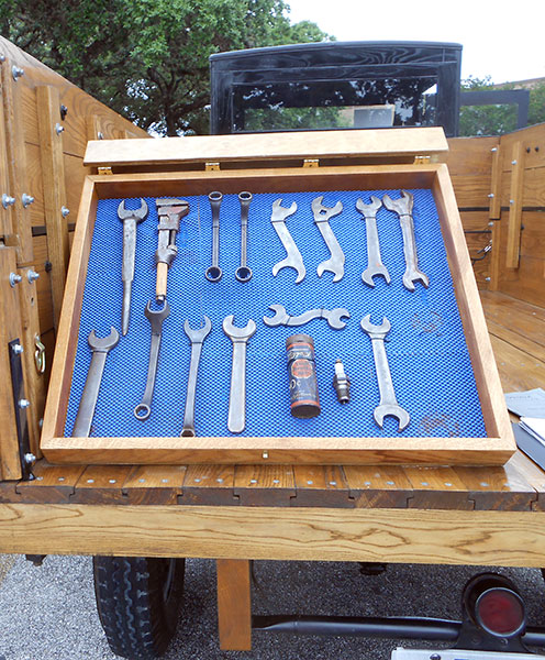 Model T tool display in the cargo bed of DuWayne Headrick's 1926 Ford Model TT at the 2016 Shriner charity car show
